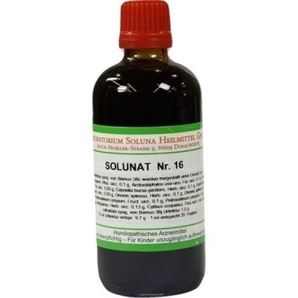 Solunat 16, è un Farmaco Omeopatico Spagirico prescritto per Malattie Infiammatorie e Degenerative Urgogenitale, Cistite, mielonefrite, glumenurolefrite, calcolosi, malattie croniche essudative della pelle e delle mucose e ipertonia renale.
