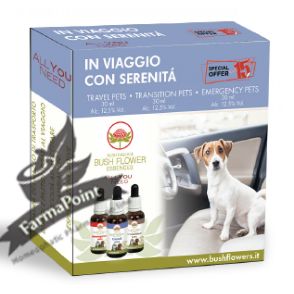 Viaggiare con il proprio animale e condividere la bellezza di questa esperienza è a volte una necessità, ma è prima di tutto un piacere irrinunciabile. Purtroppo i nostri amici non sempre vivono con serenità lo spostamento soprattutto se hanno malesseri legati al movimento o se hanno difficoltà ad adattarsi al cambiamento che il viaggio inevitabilmente implica. Le miscele di Essenze Floreali Australiane contenute in questo box sono pensate appositamente per aiutare i nostri animali a vivere, con serenità ed equilibrio, qualsiasi spostamento, anche i più brevi. Favoriscono il controllo di emozioni intense che possono scaturire da paura o da esperienze negative e facilitano l’apertura alle novità migliorando l’adattamento ai nuovi ambienti. Aiutano l’animale ad accettare gli spostamenti anche in spazi ristretti e ad affrontare il viaggio con serenità.